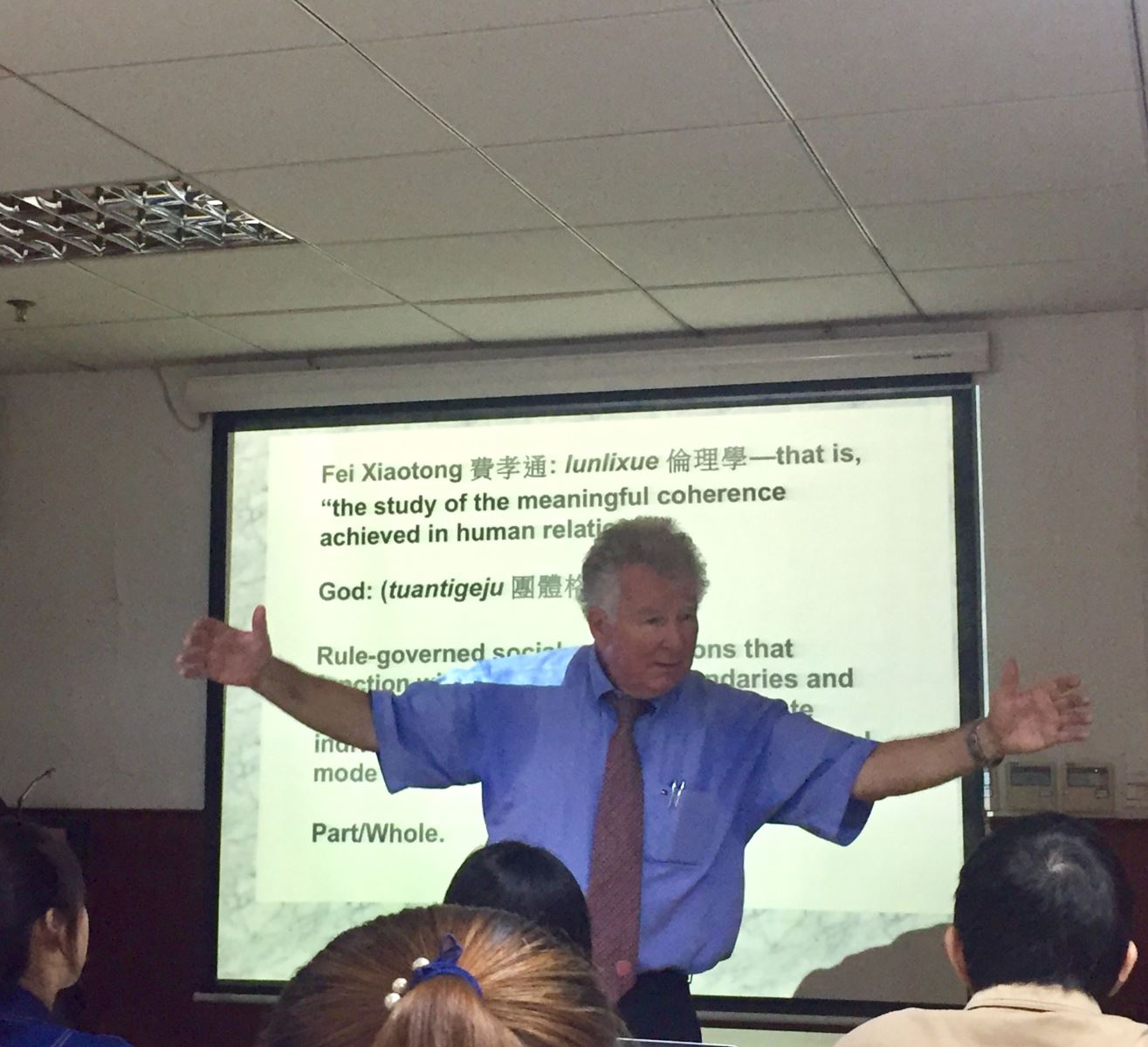 讲座伊始,安乐哲教授便以一句简单的“Everybody stand up”为例,探讨了中西方哲学文化上的差异性。他指出,西方文化中的一个核心观念就是个人主义。西方十分重视个体与自我意识,因此英语中才有“everybody”、“nobody”、“anybody”这些着重突出个人概念的词汇。而汉语则大不相同,如这句话中的“everybody”通常被译为“大家”这一具有集体概念的词语。中国崇尚群体意识、强调同一性,认为“天人合一”,自然界与人是一个和谐的整体。这种哲学思想渗透到人们的思想中,便形成了整体性的思维方式。而西方哲学则主张个人至上,强调人与自然的对立,重分析而轻综合。另外,他也提到了中国哲学里过程性的宇宙论观,从“人”到“仁”的转变便是如此。“人”只有通过与他人间的社会联结,才能逐渐达到“仁”的状态。