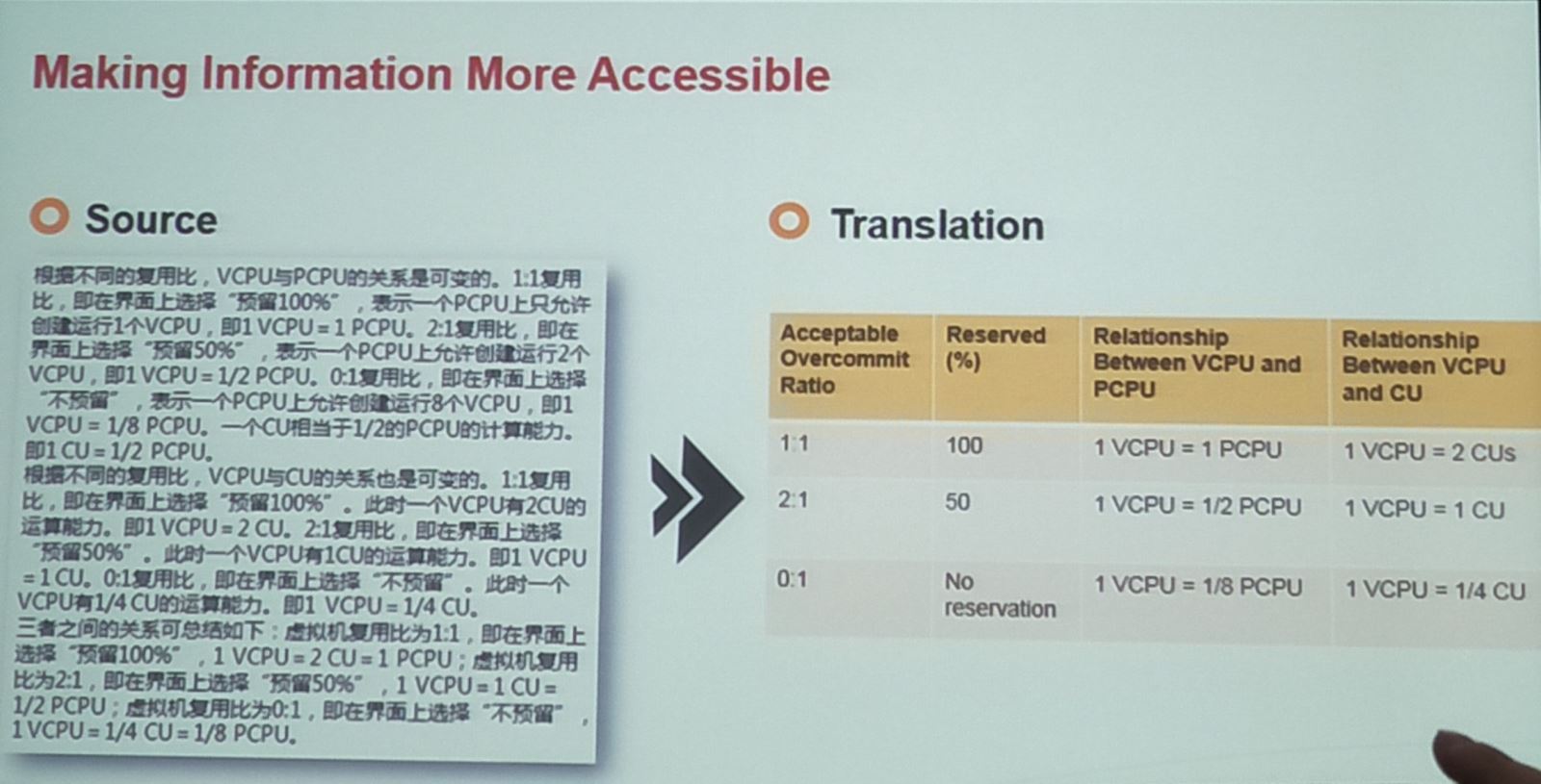 陈先生用几个生动形象的例子让大家对“以用户为导向”这一理念有了更具象的理解:华为手机曾将美颜相机中的“一键美白”功能翻译成“whiten”,这虽然算得上忠于原文,却可能会引起黑人用户的不适;手机运动app曾将运动里程耗费的热量类比为两碗米饭的热量,中国或东亚用户对此一目了然,然而拥有其他饮食习惯的用户却可能会一头雾水。陈先生还给出了一个成功的范例:译者对几十行掺杂着专业术语和数字的源文本进行了简化和重组,将其处理为一张清晰明了的表格(如图),使用户能够迅速定位和获取所需信息。上述失败和成功的案例都启示我们,译员在进行技术翻译时,所传递的信息不仅要准确,更要能为目标读者接受。