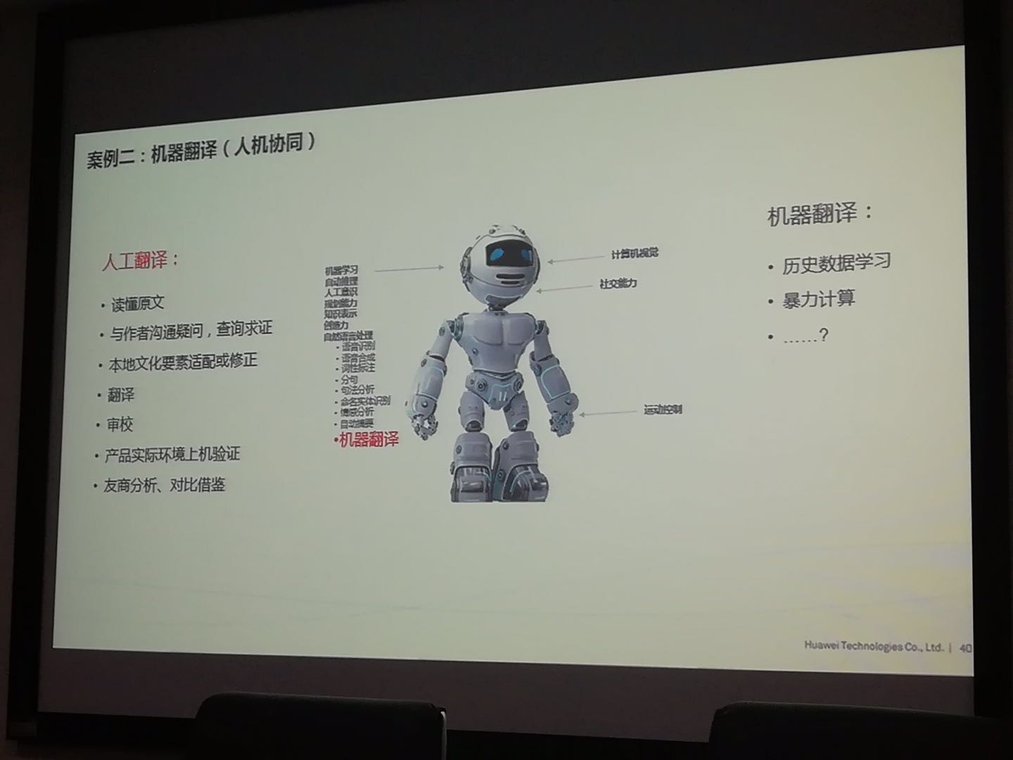 此外,技术翻译的创新也刻不容缓。目前,华为日均翻译需求达数百万字,并且交付时间短,质量要求高。面对如此繁重的任务,仅凭人力远达不到公司对于翻译中心的要求。因此华为加大了在机器翻译领域、在线翻译平台以及各种翻译模式等领域的投入,使人机协同翻译成为目前翻译中心的主要工作模式。陈先生还指出人工智能的发展成熟必然会带来新一轮的技术革新,并且这种革新在翻译领域已经初见端倪,其中最明显的便是神经机器翻译技术(NMT)的使用。NMT因其强大的数据中心使得机器越来越会说“人话”,越来越智能。陈先生还给大家展示了针对机器翻译的图灵测试,其结果表明,对同一篇文档而言,机翻和人翻的界限越来越模糊,各自所产出的译文质量差别越来越小,这再次说明机器翻译的强大优势。
