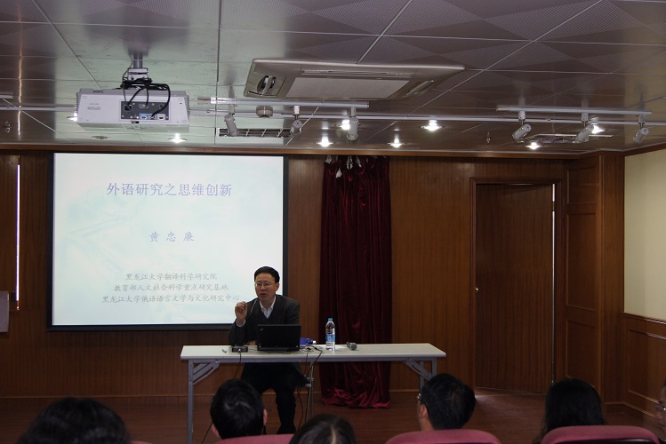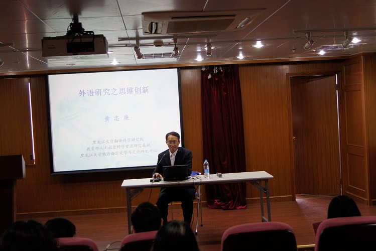 2014年4月18日,黑龙江大学翻译科学研究院院长、博士生导师黄忠廉教授应邀来到开元网站登录入口外文学院,在文科楼209室为老师们做了题为“外语研究之思维创新——从析例实践到思想犀利”的精彩讲座。此次讲座由翻译系主任蔡基刚教授主持,由此拉开了外文学院青联会之科研篇系列讲座活动的序幕。
