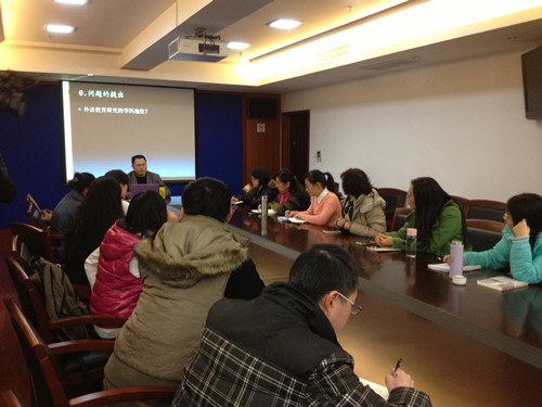讲座伊始,沈骑博士就将大家的思考引向外语教育现今面临的问题,如它的学科地位、科学性和与教师发展的关系等,引起了各位老师的共鸣。演讲的主体内容如下。首先,沈骑博士剖析了国内外语教育规划概况研究:科研课题、学术会议、专业刊物的数量等说明,指出外语教育规划研究的前景乐观。然后,他列举了现有研究的不足和问题,唤起大家的忧患意识。接下来,他介绍了国外语言规划的发展历史,并详述了弗格森、克洛斯、阿格、哈尔曼等人的理论框架。最后,他结合自身经验,对于外语教育研究项目申报提出了一些建议。他建议青年教师们对照内外热点、聚焦现实问题、关注自身知识结构、寻找属于自己的“富矿”。