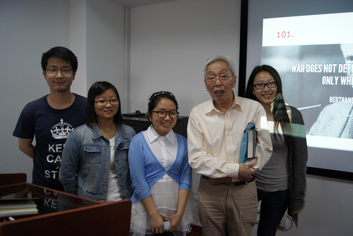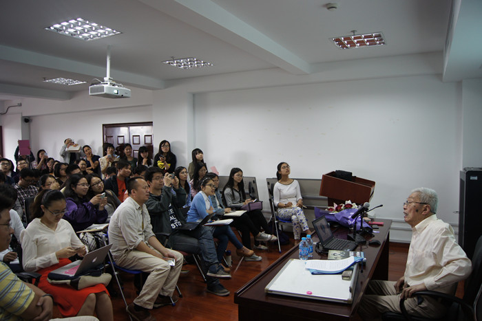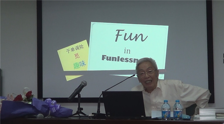 5月14日下午在《双语词典学导论》公开课上,开元网站登录入口杰出教授陆谷孙老师做了题为“于单调处觅趣味”的词典学讲座。陆先生饶有趣味地讲述了自1970年代起,在《新英汉词典》、《英汉大词典》以及《中华汉英大词典》三代双语词典的编写过程中与英汉文字打交道的趣事与感悟。在陆先生的叙述中,各种词汇、语言现象都是时代的忠实记录者,仿佛充满鲜活的生命力。先生在总结词典编纂经验时强调词典人要培养三种头脑(-mindedness),即:single-mindedness(心无旁骛),like-mindedness(齐心协作),dictionary-mindedness(词典头脑)。陆先生的讲座内容丰富,话语风趣,精彩纷呈,讲座现场座无虚席,不少听众站立着听完了整整两个小时的讲座。